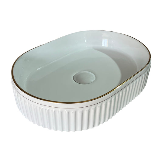 כיור מונח חרס אובלי מחורץ לבן מבריק בשילוב פסי ברונזה LUSSO