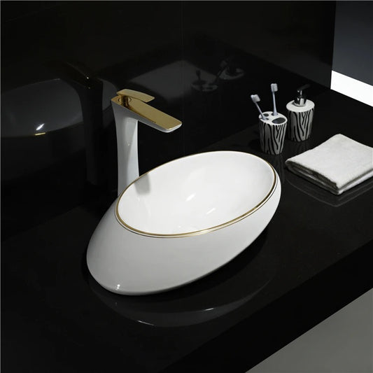כיור מונח חרס צורת ביצה לבן ופסי ברונזה TOP
