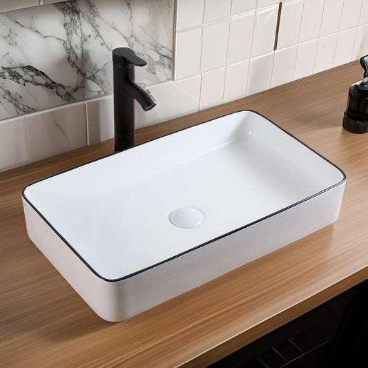 כיור מונח חרס מלבני לבן מבריק -פס שחור