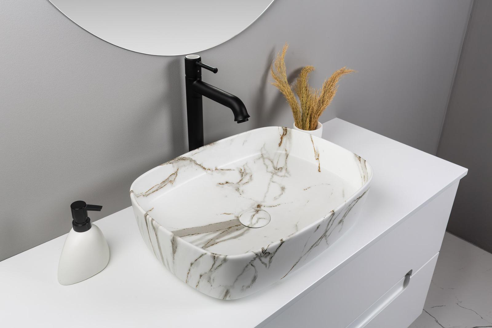 כיור מונח אובלי דמוי שיש לבן עם ורידים זהובים