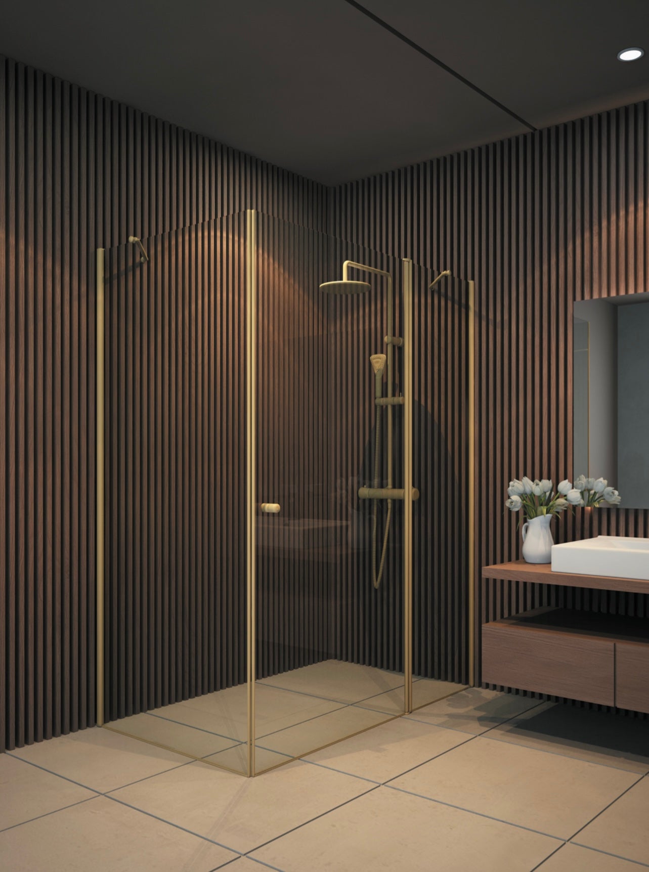 מקלחון פינתי זהב מט - קיר צד, דופן קבועה ודלת פתיחה החוצה בלבד